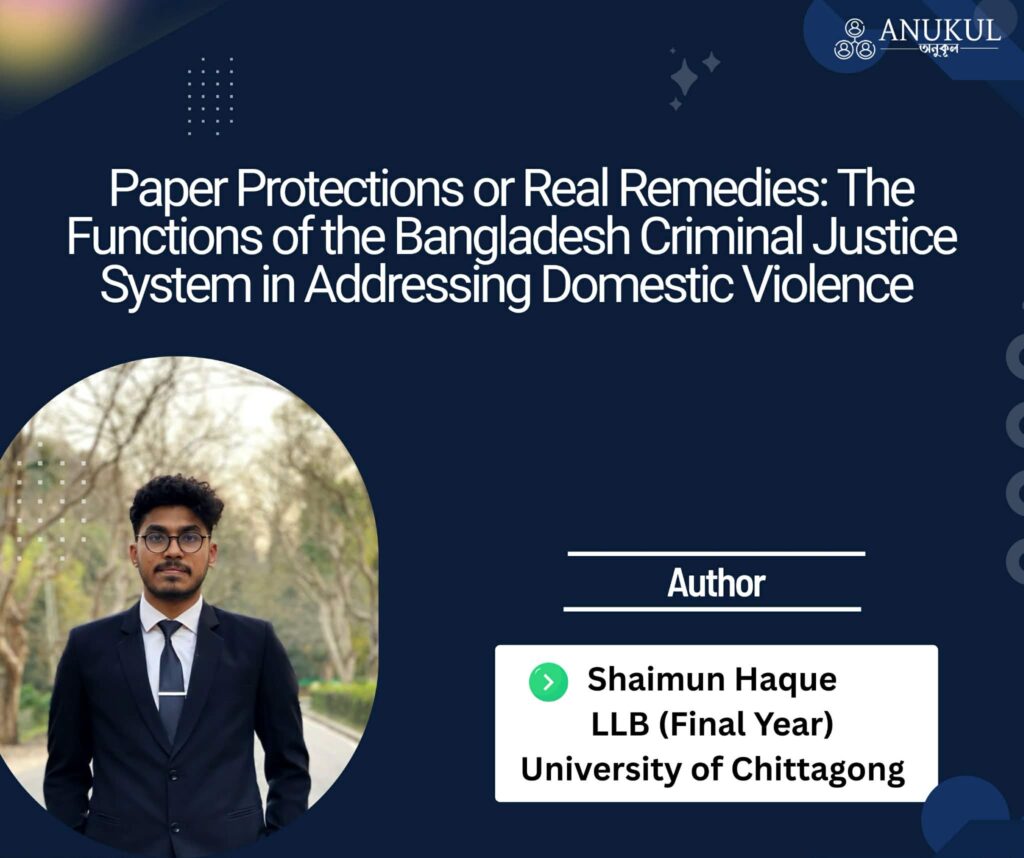 BlogPaper Protections or Real Remedies: The Functions of the Bangladesh Criminal Justice System in Addressing Domestic ViolenceBlog / Maksud Introduction Bangladesh enacted the Domestic Violence (Prevention and Protection) Act, 2010 to offer victims prompt civil protection, state assistance, and