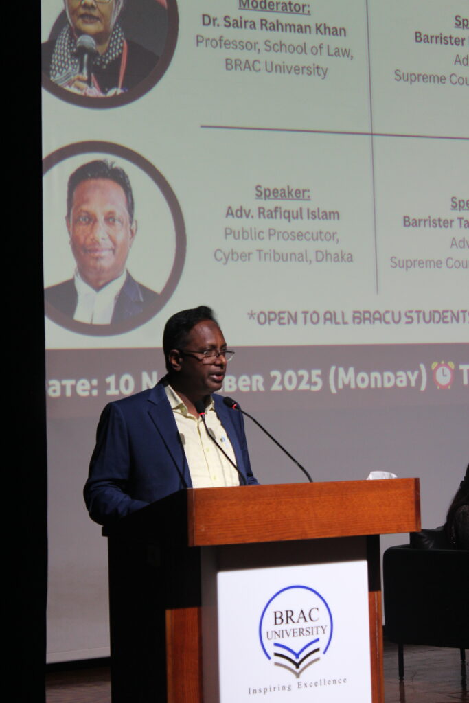 𝐀𝐝𝐯. 𝐑𝐚𝐟𝐢𝐪𝐮𝐥 𝐈𝐬𝐥𝐚𝐦, Public Prosecutor, Cyber Tribunal, Dhaka, shared valuable perspectives on “The Law, the Procedure, and the Tribunal: Examining the Judicial Path of Online Harassment Cases.”
